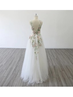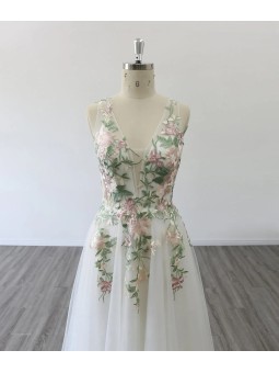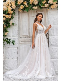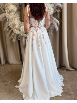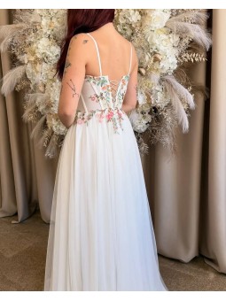 Elegantní a romantické svatební šaty s hlubokým výstřihem do „V“ a halter střihovým řešením živůtku - kolem krku, který krásně zvýrazňuje dekolt i ramena. Šaty mají odhalená záda. Živůtek je zdobený jemnou květinovou výšivkou v růžových a zelených tónech, která plynule přechází do pasu a částečně...