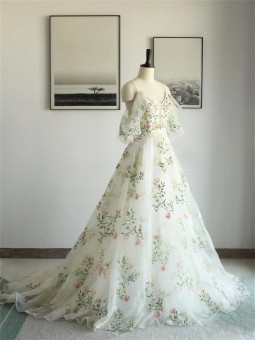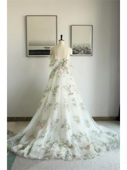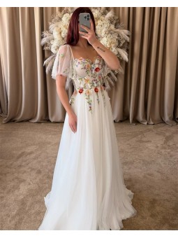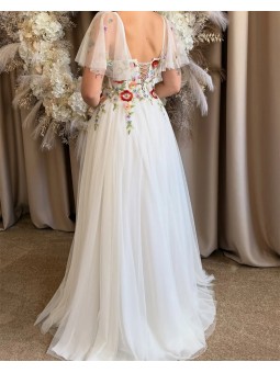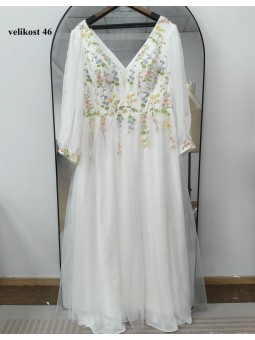 Květinové tylové svatební šaty se spadlými rukávky. Šaty mají knoflíky vpředu. Délka šatů je cca nad kotníky - dle Vaši výšky. Konfekční velikosti mají záda na šněrovačku, při šití na míru lze ušít na zip. Při šití na míru lze model poupravit včetně délky šatů. Možné šití na míru za příplatek...