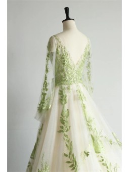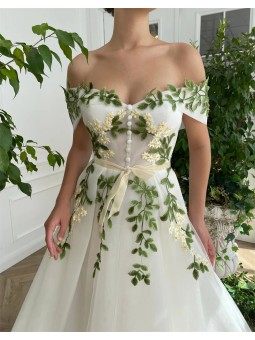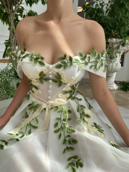 Staň se vílou svého svatebního dne v těchto jedinečných šatech, které propojují romantiku s přírodní elegancí. Šaty jsou zdobené bohatou zelenou výšivkou v motivu listů, jež šatům dodává svěžest a originalitu. Hluboký výstřih do „V“ na přední i zadní straně krásně zvýrazní siluetu, zatímco...