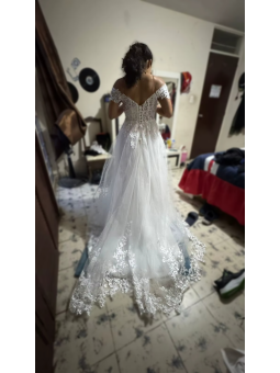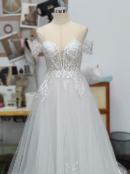 Svatební tylové svatební šaty zdobené krajkous se spadlými rameny. Na šněrovačku. Při šití na míru lze model poupravit a ušít v jiné barvě, na zip, pro změny nás nejdříve kontaktujte. Možné šití na míru za příplatek +500,- Kč (doba doručení kolem 6-8 týdnů při šití na míru) . Pro volbu šití na...