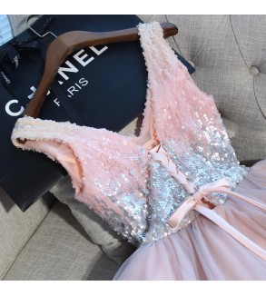 Večerní třpytivé šaty se špagetovými ramínky a odhalenými zády. Záda na šněrovačku. Šaty mají skryté kapsy