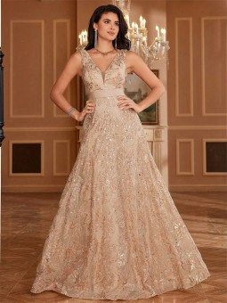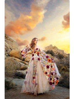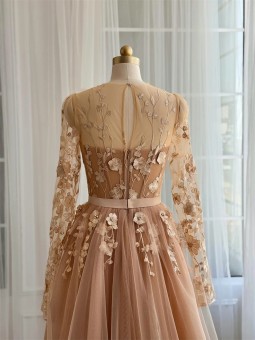 Champagne šaty s dlouhými rukávy a 3D květinovou výšivkou Něžné, romantické a mimořádně elegantní. Horní část šatů je zdobena detailní 3D květinovou výšivkou, která vytváří jemnou strukturu a přitahuje pozornost na dekolt a pas.  Dlouhé krajkové rukávy s květinovými motivy dodávají šatům...