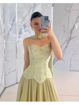Luxusní společenské šaty s korzetovým živůtkem se srdcovým výstřihem a odnímatelným šálem. Top zdobený kamínky. Na šněrovačku. Materiál šatů je splývavý šifón. Barva v konfekčních velikostech je zelená (do olivova). Při šití na míru lze model poupravit a ušít v jiné barvě, pro změny nás nejdříve...