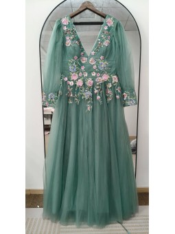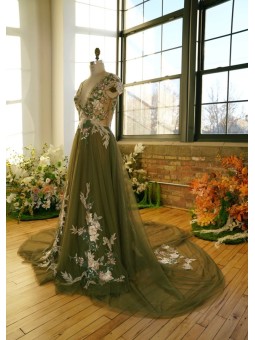 Olivově zelené tylové šaty s květinovou výšivkou Tyto jedinečné společenské šaty působí jako z pohádky — kombinují jemnost, eleganci a přírodní romantiku. Vrchní díl z jemného tylu s průsvitným základem zdobí bohatá 3D květinová výšivka v tónech krémové, béžové a zelené. Sukně z lehkého tylu v...