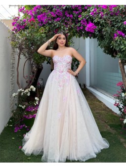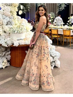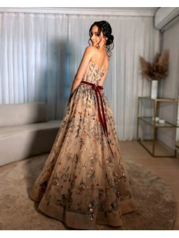 Luxusní tylové společenské šaty s květinovou výšivkou  Okouzlující korzetové šaty, které zaujmou na první pohled. Střih:  áčková sukně  Vrchní díl: pevný korzet bez ramínek, zvýrazňující postavu Materiál:  tyl v tělovém odstínu s barevnou květinovou výšivkou a jemnými flitry...