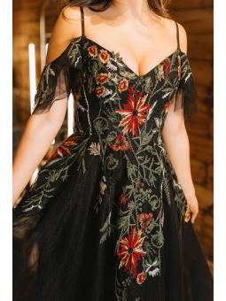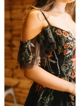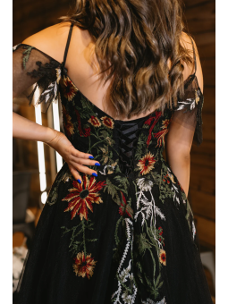 Černé šaty s květinovou výšivkou a šněrovačkou  Tyto výjimečné šaty kombinují eleganci černé barvy s romantikou výrazné květinové výšivky. Korzetový živůtek se spadlými ramínky působí něžně a ženským způsobem zvýrazňuje dekolt. Bohatá tylová sukně. Šněrovačka na zádech umožňuje dokonalé...