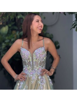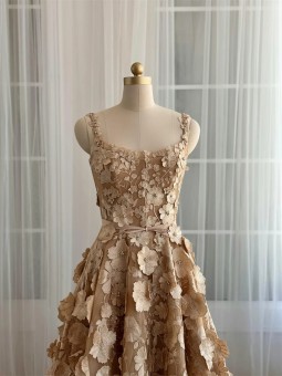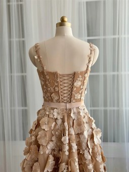 Luxusní večerní šaty s 3D květinovou aplikací – šampaň barva Celý model je pokryt propracovanými 3D květinovými aplikacemi, které vytvářejí bohatou texturu.  Střih ve stylu A-linie krásně zvýrazňuje pas a lichotí ženské siluetě.  Top je korzetový se šněrovačkou, díky kterému lze model...