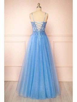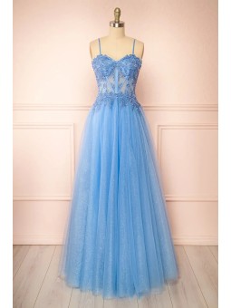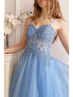 Romantické modré společenské šaty s květinovou aplikací Nádherné dlouhé šaty v jemně modrém odstínu (nejlépe barvě odpovídají první 2 fotografie), které podtrhnou něžnost a eleganci. Střih: áčková sukně Vrchní díl: korzetový s jemným řasením, zdobený krajkovými aplikacemi a 3D květy...