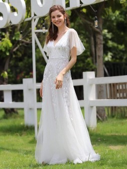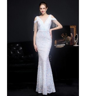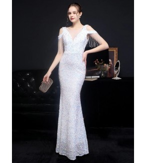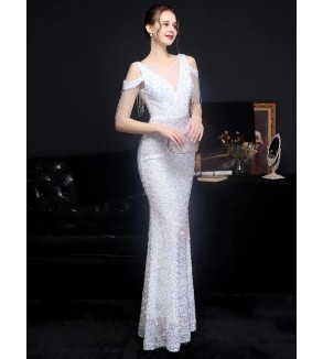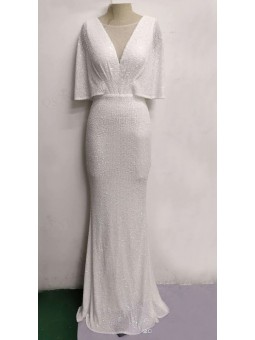 Třpytivé dlouhé večerní šaty mají dvojitý hluboký výstřih do V s volnými rukávy.  Šaty jsou na zip