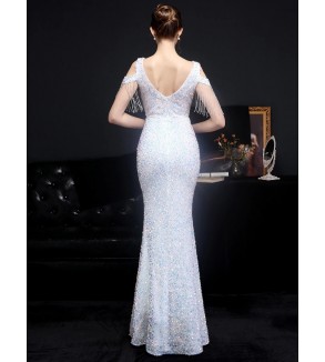Flitrové šaty - střih sukně typu mořská panna Spadlé ramena s třásněmi z korálků Zapínání na zip