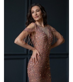 Flitrové šaty - střih sukně typu mořská panna Spadlé ramena s třásněmi z korálků Zapínání na zip