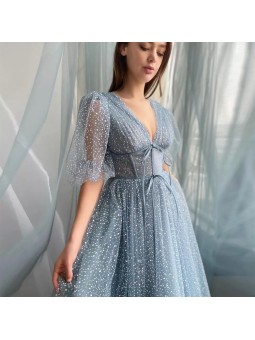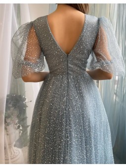 Večerní šaty s třpytivým flitrovým topem bez rukávů, se zdůrazněným pasem. Asymetrický střih sukně dodává šatům originální šmrnc. Zapínání: Vzadu je skrytý zip. Šaty mají vycpávky - není nutné mít podprsenku, s podšívkou. Látka: tyl, saténová podšívka