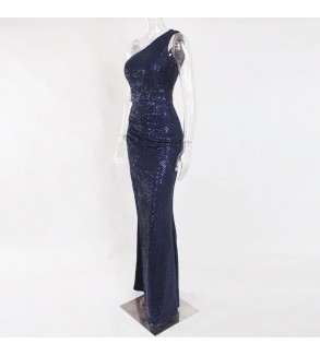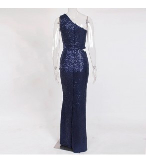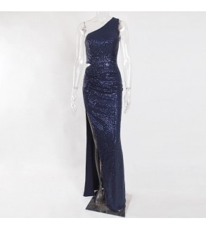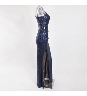 Flitrové šaty s rozparkem a průstřihem Zapínání na zip Barvy: šampaň se stříbrnými flitry, tmavě modré