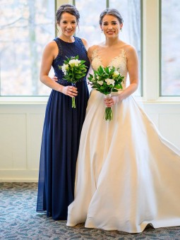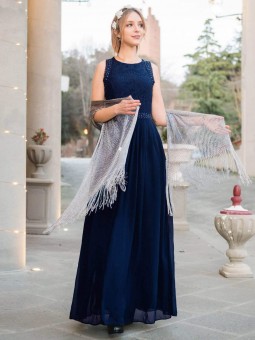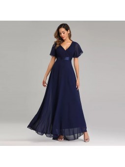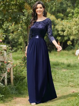 Krajkové společenské šaty v délce až po zem jsou jedinečně doplněny širokým páskem lichotícím postavě, který zvýrazňuje linii pasu. Záda střižená ve tvaru V. Zapínání: Vzadu na skrytý zip. Šaty lze vzít bez podprsenky, jsou v nich vyspávky a podšívka. Látka: šifón a krajka
