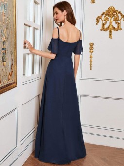 Romantické šaty se spadlými volánkovými rameny a špagetovými ramínky. Šaty jsou s rozparkem Zapínání: Vzadu je skrytý zip. Šaty mají vycpávky a podšívku Látka: šifón