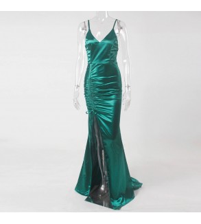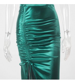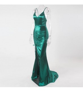 Saténové šaty s nadrhnutým rozparkem. Zapínání na zip, na prsou všité vycpávky