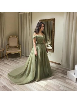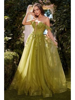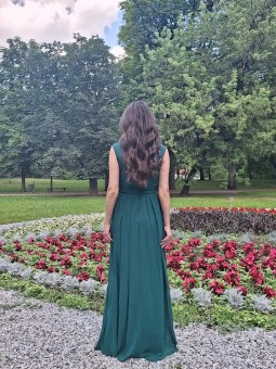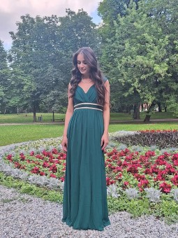 Luxusní společenské šaty s korzetovým živůtkem se srdcovým výstřihem a odnímatelným šálem. Top zdobený kamínky. Na šněrovačku. Materiál šatů je splývavý šifón. Barva v konfekčních velikostech je zelená (do olivova). Při šití na míru lze model poupravit a ušít v jiné barvě, pro změny nás nejdříve...