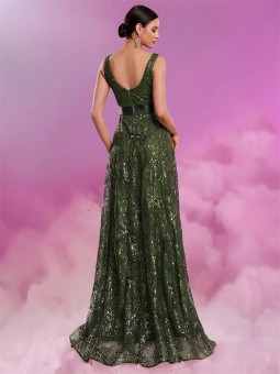 Třpytivé dlouhé večerní šaty mají dvojitý hluboký výstřih do V s volnými rukávy. Šaty jsou na zip