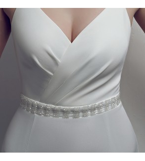 Krajkové šaty v délce až po zem jsou jedinečně doplněny širokým páskem lichotícím postavě, který zvýrazňuje linii pasu. Záda střižená ve tvaru V. Zapínání: Vzadu na skrytý zip. Šaty lze vzít bez podprsenky, jsou v nich vyspávky a podšívka. Látka: šifón a krajka