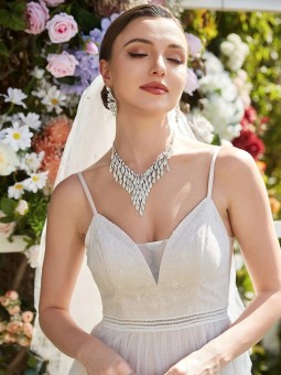 Svatební šaty se špagetovým ramínkem a výstřihem do V mají siluetu áčkového střihu s krásným empírovým pasem, což jim dodává retro eleganci. Díky splývavé siluetě z vrstveného tylu až po zem jsou tyto klasické svatební šaty sofistikované. Zapínání: Vzadu je skrytý zip. Lze nosit bez podprsenky....