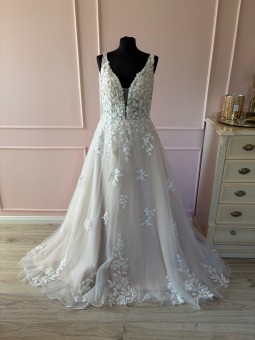 Romantické svatební šaty s krajkovou výšivkouOkouzlující svatební šaty v jemném šampaň odstínu a nádhernou krajkovou aplikací po živůtku a horní části sukně. Hluboký výstřih do V vpředu působí smyslně, zatímco bohatá tylová sukně dodává šatům pohádkový vzhled. Ideální pro nevěsty, které touží...