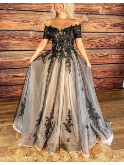 Tylové šaty se spadlými rameny zdobené krajkou. Na topu jsou i kamínky na 3D kytičkách. Šaty jsou na zip, při šití na míru lze ušít i na šněrovačku. Barvy: černá s nude podkladem a černou krajkou. Šedá s bílou krajkou. Bílá s bílou krajkou a nude podkladem. Při šití na míru možné jiné barevné...