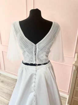Tylové svatební šaty s krajkovým topem. Saténová spodnička.  Zapínání na zip s ozdobnými knoflíky. Barvy: bílá a ivory  Možné šití na míru za příplatek +500,- Kč (doba doručení kolem 6-8 týdnů při šití na míru) . Pro volbu šití na míru zvolte velikost NA MÍRU a přidejte Vaše míry dle instrukcí...