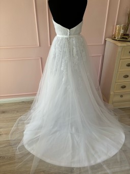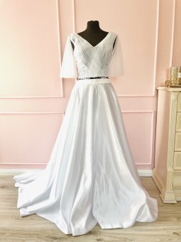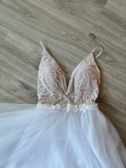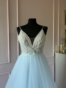 Tyto okouzlující svatební šaty přinášejí dokonalou kombinaci nadčasové elegance a pohádkového vzhledu. Hladký korzetový živůtek s jemným zdobením z umělých perel podtrhuje ženské linie a vytváří nádherně tvarovaný dekolt. Dominantním prvkem šatů je velká saténová mašle, která dodává celému...