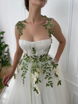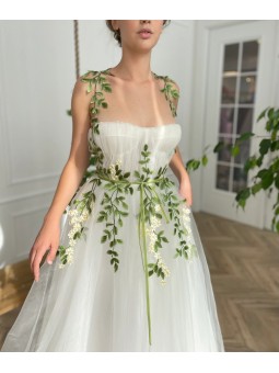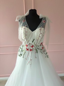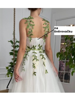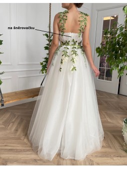 Květinové tylové svatební šaty s V výstřihem. Sukně s rozparkem. Zapínání na zip. Při šití na míru lze model poupravit. Možné šití na míru za příplatek +500,- Kč (doba doručení kolem 6-8 týdnů při šití na míru) . Pro volbu šití na míru zvolte velikost NA MÍRU a přidejte Vaše míry dle instrukcí...