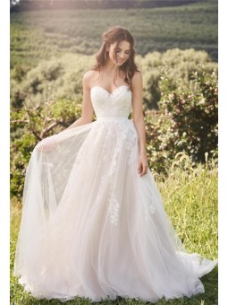 Romantické svatební šaty s květinovou aplikací  Tyto kouzelné svatební šaty působí jako ze snu. Bohatá tylová sukně s vlečkou dodává nevěstě majestátní vzhled, zatímco korzetový živůtek se spadlými rameny a romantickým srdíčkovým výstřihem zvýrazňuje ženskou siluetu. Celé šaty jsou zdobené...