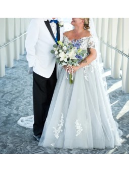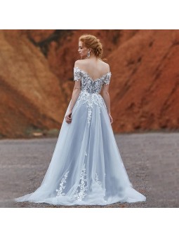 Tylové šaty se spadlými rameny zdobené krajkou. Na topu jsou i kamínky na 3D kytičkách. Šaty jsou na zip, při šití na míru lze ušít i na šněrovačku. Barvy: černá s nude podkladem a černou krajkou. Šedá s bílou krajkou. Bílá s bílou krajkou a nude podkladem. Při šití na míru možné jiné barevné...
