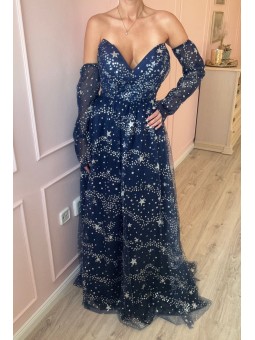 Tmavě modré tylové šaty jako z pohádky s noční oblohou (tmavě modro stříbrná varianta v konfekčních velikostech). Šaty se třpytí. • Šaty mají rukávy zvlášť, lze nosit s i bez. • Zapínání na zip. • Šaty mají rozparek Možné šití na míru za příplatek +500,- Kč (doba doručení kolem 6-8 týdnů...