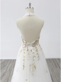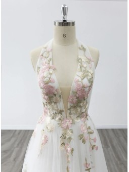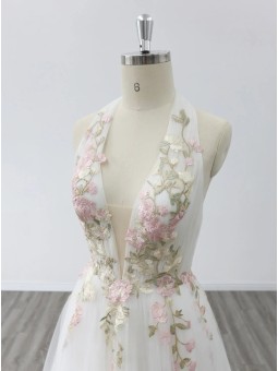 Elegantní a romantické svatební šaty s hlubokým výstřihem do „V“ a halter střihovým řešením živůtku - kolem krku, který krásně zvýrazňuje dekolt i ramena. Šaty mají odhalená záda. Živůtek je zdobený jemnou květinovou výšivkou v růžových a zelených tónech, která plynule přechází do pasu a částečně...