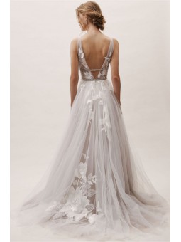 Svatební šaty se špagetovým ramínkem a výstřihem do V mají siluetu áčkového střihu s krásným empírovým pasem, což jim dodává retro eleganci. Díky splývavé siluetě z vrstveného tylu až po zem jsou tyto klasické svatební šaty sofistikované. Zapínání: Vzadu je skrytý zip. Lze nosit bez podprsenky....