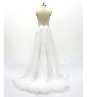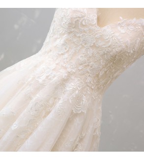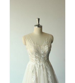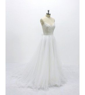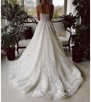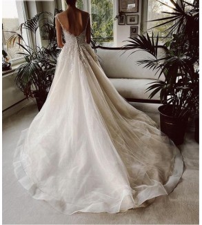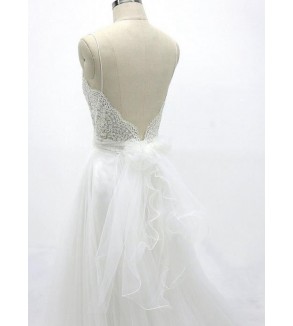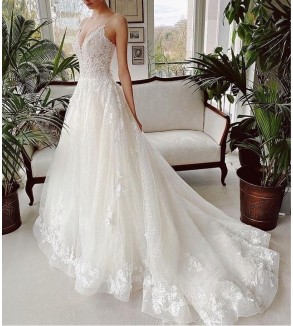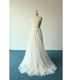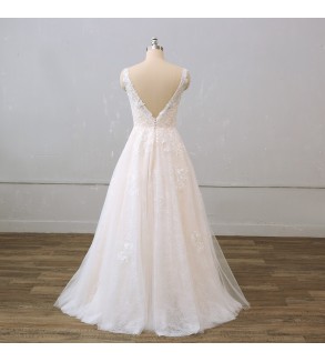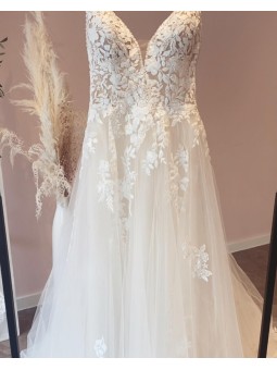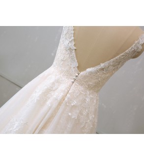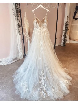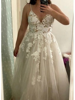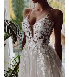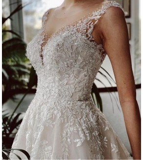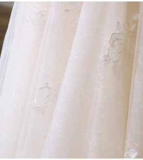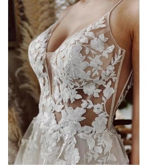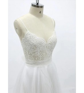 Jednoduché svatební šaty na zip nebo popůlnočky s ramínky ozdobené květinovou krajkou Šaty mají V výstřih. Tylová sukně se saténovou podšívkou