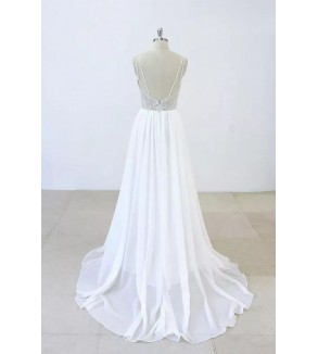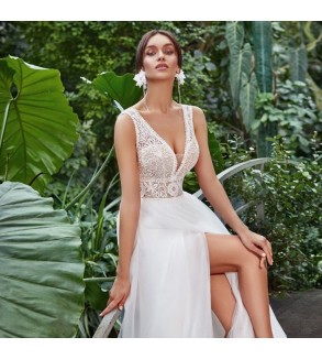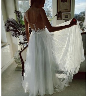 Svatební šaty s rozparkem. Zapínání na zip. Šití pouze na míru (doba doručení kolem 6-8 týdnů při šití na míru) . Do poznámky přidejte Vaše míry dle instrukcí Odkaz .Při objednání na míru akceptujeme pouze platby předem (převodem / GoPay). Šití max. do vel. 46, větší velikosti za příplatek...