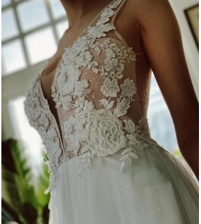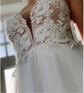 Svatební šaty na zip a knoflíky. Šití pouze na míru (doba doručení kolem 6-8 týdnů při šití na míru) . Do poznámky přidejte Vaše míry dle instrukcí https://www.nejkrasnejsisaty.cz/content/17-jak-zmerit-miry .Při objednání na míru akceptujeme pouze platby předem (převodem / GoPay). Top je podšitý...
