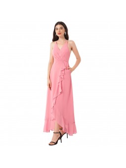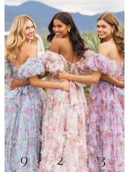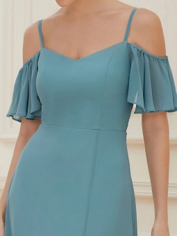 Romantické šaty se spadlými volánkovými rameny a špagetovými ramínky. Šaty jsou s rozparkem Zapínání: Vzadu je skrytý zip. Šaty mají vycpávky a podšívku Látka: šifón
