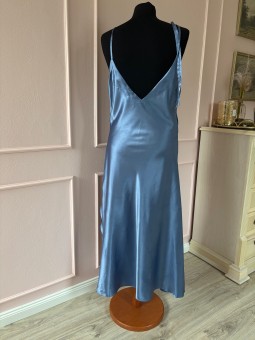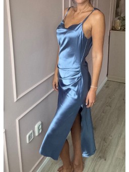Midi saténové šaty jsou vyrobeny ze saténu. S rozparkem na boku. Zapínání na zip v boku. Vázací ramínka - délka je počítaná s ramínky. Skladem vel. 40 v modré.