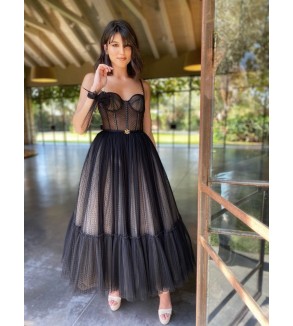 Netradiční svatební šaty či honosné večerní šaty. Bohatá tylová sukně a top zdobený krajkou. Zapínání na zip. Při šití na míru lze ušít i na šněrovačku. Lze objednat i v bílé a ivory barvě. Možné šití na míru za příplatek +500,- Kč (doba doručení kolem 6-8 týdnů při šití na míru) . Pro volbu...