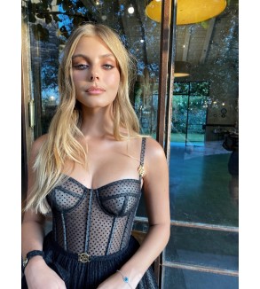 Tylové šaty se spadlými rameny zdobené krajkou. Na topu jsou i kamínky na 3D kytičkách. Šaty jsou na zip, při šití na míru lze ušít i na šněrovačku. Barvy: černá s nude podkladem a černou krajkou. Šedá s bílou krajkou. Bílá s bílou krajkou a nude podkladem. Při šití na míru možné jiné barevné...