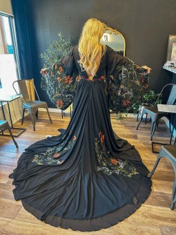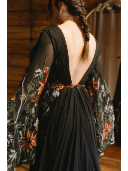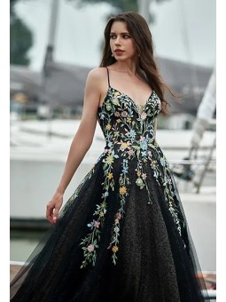 Černé šaty s květinovou výšivkou a šněrovačkou Tyto výjimečné šaty kombinují eleganci černé barvy s romantikou výrazné květinové výšivky. Korzetový živůtek se spadlými ramínky působí něžně a ženským způsobem zvýrazňuje dekolt. Bohatá tylová sukně. Šněrovačka na zádech umožňuje dokonalé...