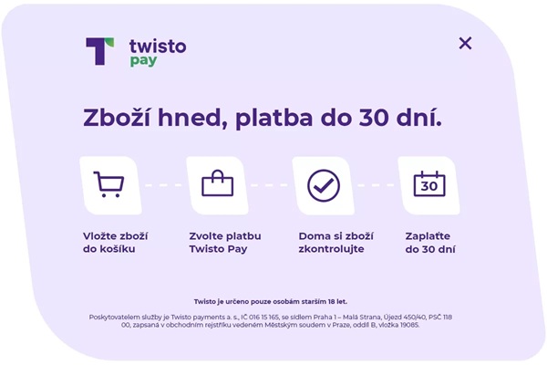 Zákazník si na platební bráně vyberou jednu z možností odložené platby a platbu provede prostřednictvím svého účtu u Twista nebo Skip Pay. Výsledek transakce se dozvíme ihned prostřednictvím online notifikace.