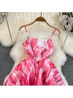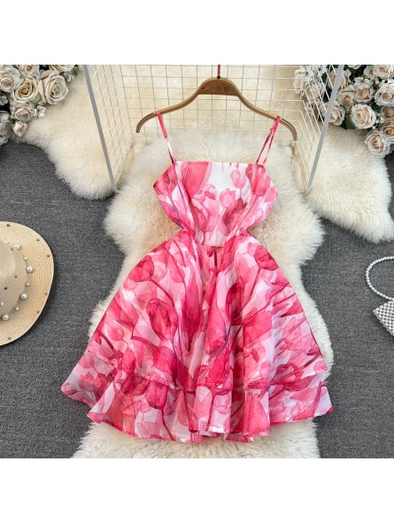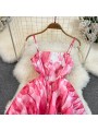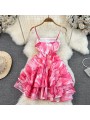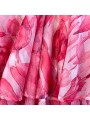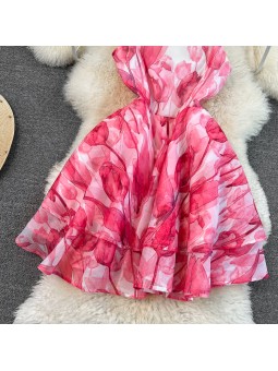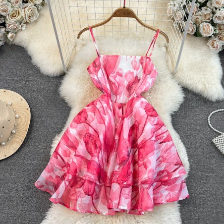 Růžové krátké šaty s volánem na konci sukně. Šaty jsou A střihu