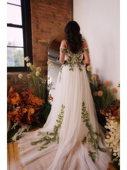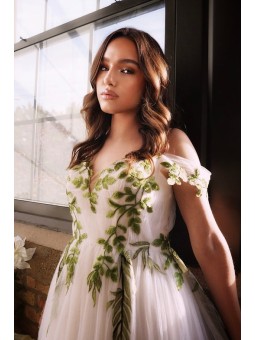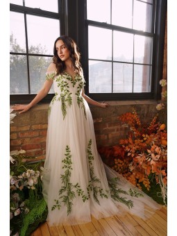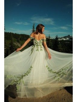 Jedninečné romantické tylové šaty s vyšívanými aplikacemi zelených listů. • Srdíčkový výstřih • Plisovaný tyl v barvě ivory • Zářivě zelené výšivky listů • Šněrovačka na zádech • Průhledné spadlé ramínka • Tylová sukně do A Možné šití na míru za příplatek +500,- Kč (doba doručení kolem...