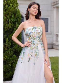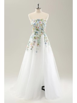 Romantické svatební šaty s květinovou aplikací Tyto kouzelné svatební šaty působí jako ze snu. Bohatá tylová sukně s vlečkou dodává nevěstě majestátní vzhled, zatímco korzetový živůtek se spadlými rameny a romantickým srdíčkovým výstřihem zvýrazňuje ženskou siluetu. Celé šaty jsou zdobené...