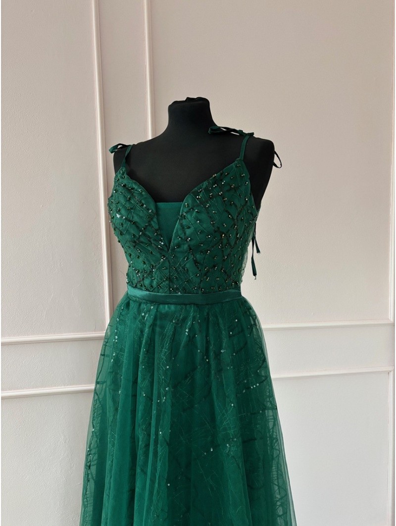 Třpytivé společenské šaty  s klasickou siluetou sukně do A. Šaty jsou na šněrovačku, ramena na zavázání.