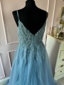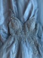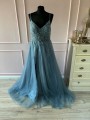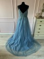 Večerní tylové šaty zdobené kamínky a krajkou na zip s rozparkem.