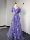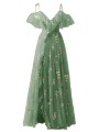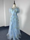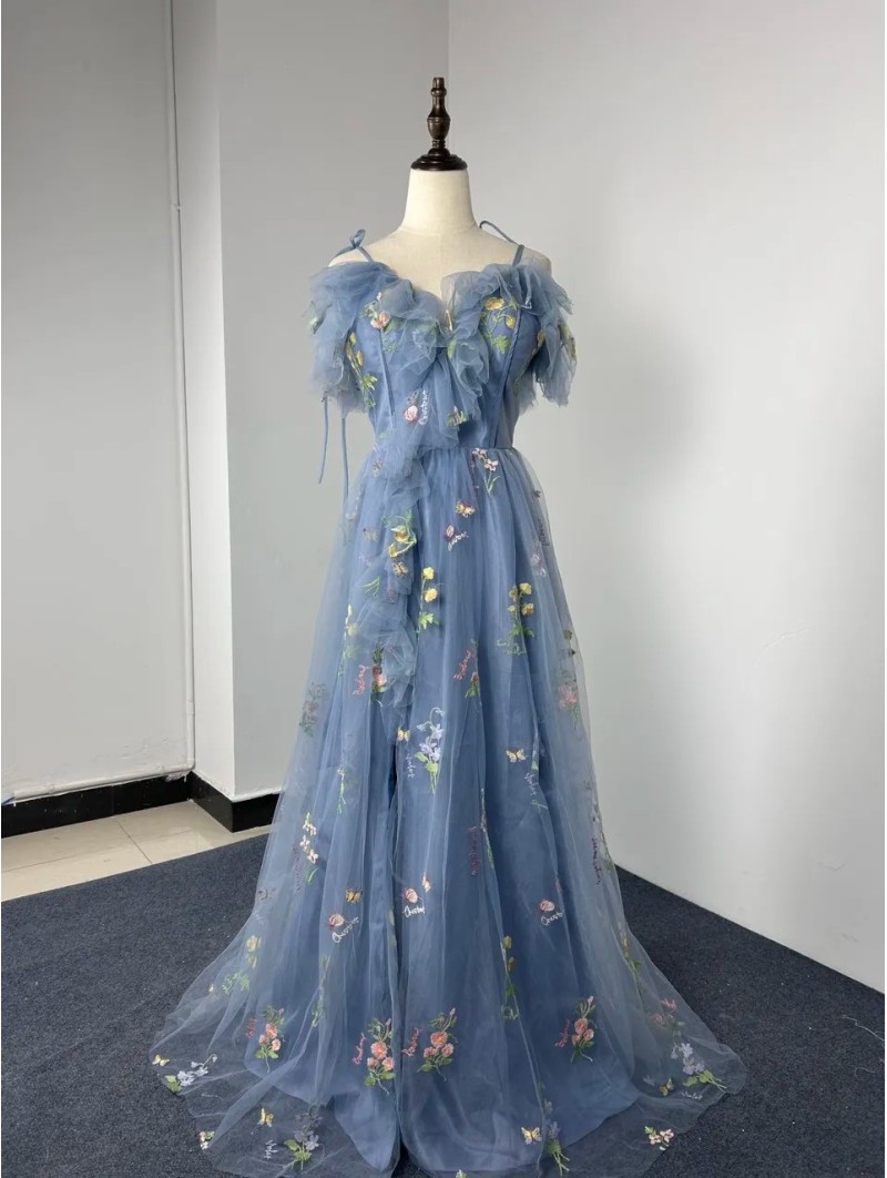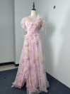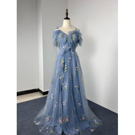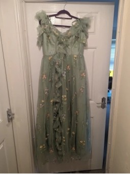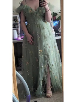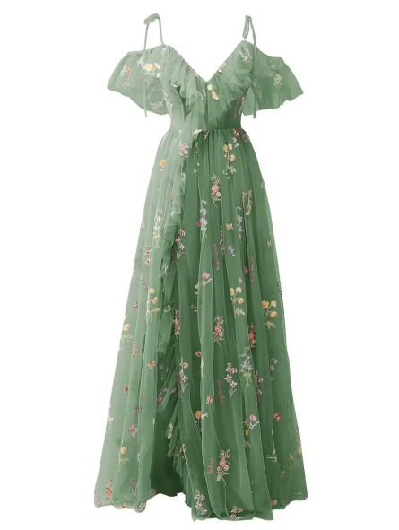 Tylové volánové květinové šaty ve stylu Bridgertonovi. Šaty mají rozparek (končí nad kolenem).