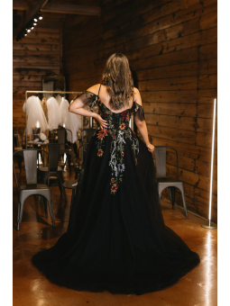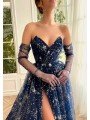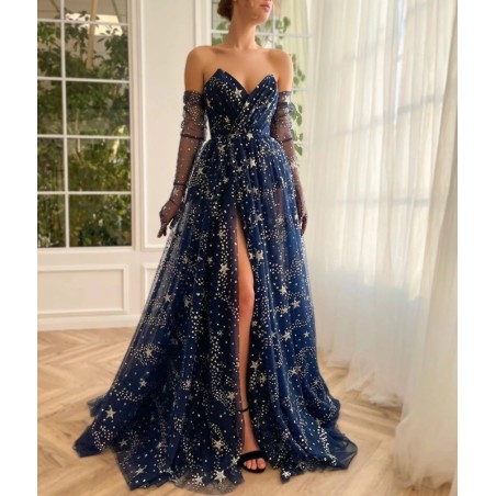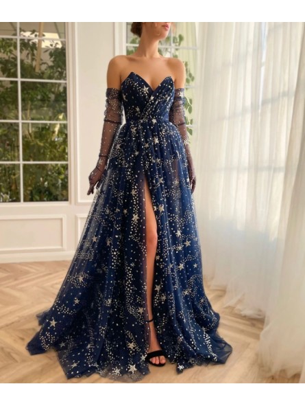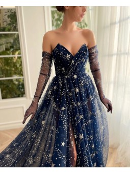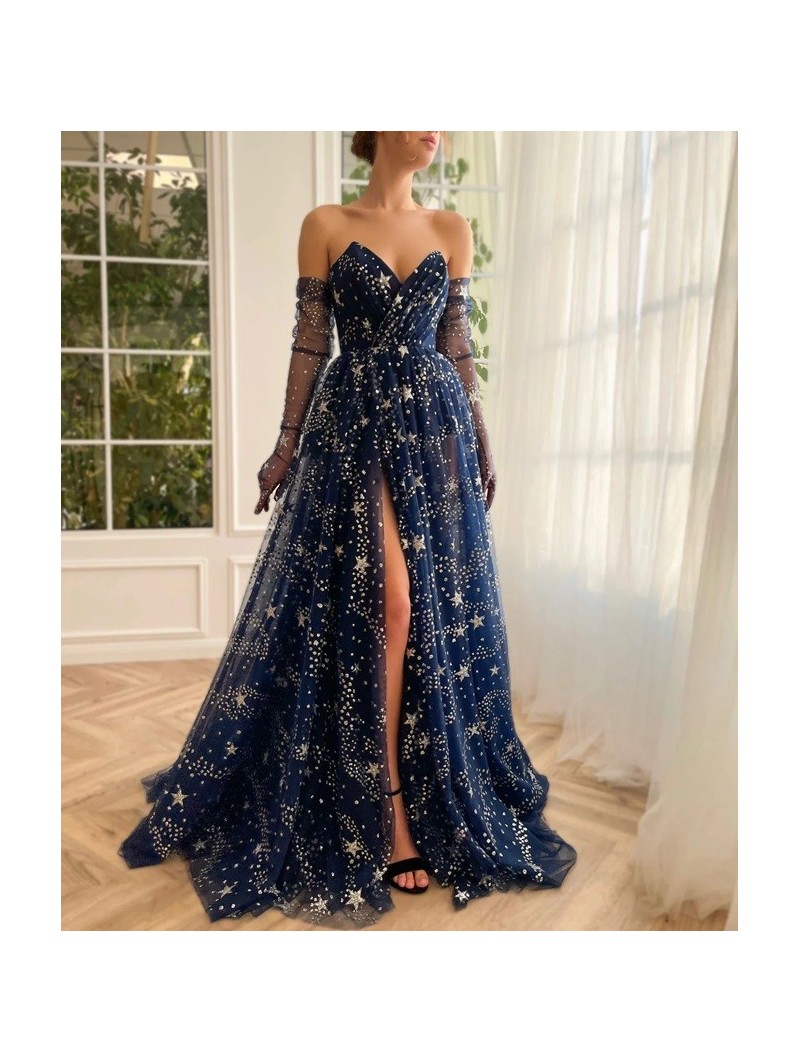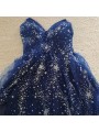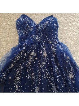 Tmavě modré tylové šaty jako z pohádky s noční oblohou (tmavě modro stříbrná varianta v konfekčních velikostech).